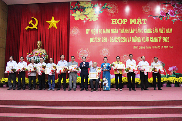 l Sáng 18-1, Tỉnh ủy Kiên Giang tổ chức buổi họp mặt kỷ niệm 90 năm Ngày thành lập Đảng Cộng sản Việt Nam và trao Huy hiệu Đảng cho các đảng viên lão thành, mừng xuân Canh Tý 2020.